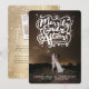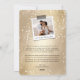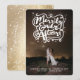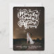 This modern and elegant holiday wedding announcement card features a 'Merrily Ever After' whimsical and unique hand drawn calligraphy script and a marriage knot with sparkling stars on a full bleed photo. The back of the card has a stylish faux gold foil image background with simple white snow dots pattern.