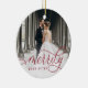 Elegant holiday photo ornament for newlyweds features a favorite wedding photo on each side, with "Merrily Ever After" overlaid in chic calligraphy script. Personalize with your names and wedding date on the back.