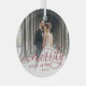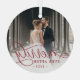 Elegant holiday photo ornament for newlyweds features a favourite wedding photo with "Merrily Ever After" overlaid in chic calligraphy script. Personalise with the year at the bottom.