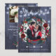 Winter rustic trendy farmhouse wedding Merrily Married photo card with white and red burgundy trendy watercolor peony roses and blooms wreath with seasonal pine hunter green fir branches and holly berries over a dark navy blue barn wood like background with string lights.++++++++ Personalise it with your photos, signature, and text on the front and back! +++++++++++++ An elegant way to announce your marriage, give thanks and send love and greetings following a winter Christmas wedding or as a newlyweds couple.