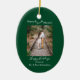 This minimalist merry and almost married holiday ornament is the perfect greeting from an engaged couple. The design features classic typography against a dark green background. Photo template via Pixabay licensed under CC0 and must be replaced with your own photo