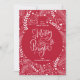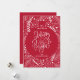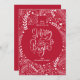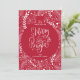 A festive Christmas holiday greeting card "merry & bright" calligraphy within a red ornament shape surrounded by white branches, boughs and stars.
