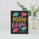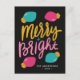 Spread holiday cheer in style with our unique holiday postcard. The non-photo holiday postcard features "Merry + Bright" on the front in gold, turquoise, pink hand-lettering against a black background. Cute Christmas light bulbs surround the text in hot pink and turquoise with gold-coloured bases. Personalise the front of the modern holiday postcard by adding your name and the year in white text. The back of the colourful holiday postcard features your return address and custom message in black text. Designed to coordinate with our Merry & Bright Christmas Lights holiday collection.