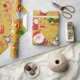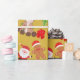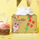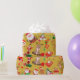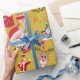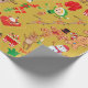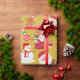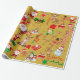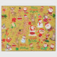 This festive wrapping paper titled "Merry and Bright Christmas" features a cheerful design on a gold background. Adorned with charming illustrations in red, green, and white, it includes adorable depictions of Santa Claus, gingerbread men, snowmen, candy canes, etc., perfect for spreading holiday cheer.