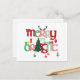 Merry and Bright Christmas in red and green lettering with retro ornaments, Christmas tree, and antlers.