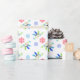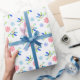 Colourful Christmas wrapping paper with a white background and festive pattern of snowflakes and Christmas lights, with graphic text reading Merry and Bright, done in light green, blue and red.