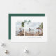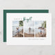 Modern minimalist typography design "Merry & Bright" Christmas photo card. Features, three vertical photo spaces, festive green "bright" script and coordinating green colour backing. Template text lines for family name on front, message and names on back.