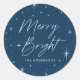 Modern holiday stickers with "Merry and Bright" displayed in a hand-lettered script encircled by a border of white stars against a navy background. Personalise the merry and bright stickers by adding your family name below. The stickers work great as envelope seals, to seal favour bags, and more!