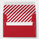 Festive cardinal red (can be modified) holiday mailing envelopes feature "Merry & Bright" in white script with custom return address text on the back flap. A contrasting pattern of red and white stripes is printed on the inside of envelope.