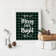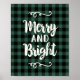 Merry and Bright holiday wall art print / poster features a brushed script typography design with scroll accents and rustic pine green and black buffalo plaid / check patterned background.