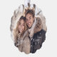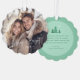 Ornament card featuring your photo and the text "Merry and Bright" in an elegant, casual script font and the year below. Add a custom message on the back. Light green or custom colour background. Simple, elegant and minimal style with simple Christmas trees and a star.