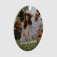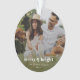 A stylish modern holiday photo ornament with a bold retro typography quote "merry & bright" in white. The greeting, name and year can be easily customized for a personal touch. A trendy, minimalist and contemporary design to stand out this holiday season! The image shown is for illustration purposes only to be replaced with your own photo. The placeholder image is of a happy young couple having a picnic with thier dog in a meadow.
