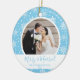 This ornament with a beautiful snowflake design on a blue background is the perfect gift for the newlywed couple in your life. The text reads "Merry and Married" and has space for the couple's name, the year, and a wedding photo.