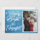 Send your loved ones a photo holiday card this season for your recent engagement! This gorgeous design features a blue snowflake bokeh background with a framed couple photo. The verbiage on the left says "Merry Bright and Engaged!" On the back, add couple initials, engagement date and a warm holiday greeting!