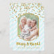 Christmas merry and bright customisable name and photo card in light pastel sky blue and white stripes pattern with gold confetti, vintage style frame and handwritten style lettering. Add your custom text to this card to create a unique christmas photo greeting this holiday season for friends and family.
