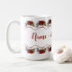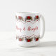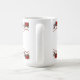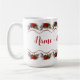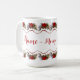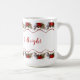 White and red colours are bold and fresh for the holidays. This mug has a border of bright red poinsettia garlands on top and bottom. A fun message, “Your name” be merry and bright!” Enjoy your cafe’, and share one for a friend.