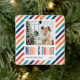 This Christmas Holiday ornament features a retro colour typography text "merry & bright", the family's names, year, and photo on a retro stripes background.