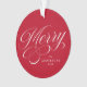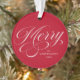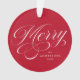 Elegant Christmas ornament featuring "Merry" on the front in a white calligraphy script overlay with a red background. Personalise the front of the ornament by adding your name and the year in white lettering. The back of the ornament displays your photo.