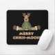 A moose in hiking boots and a green sweater and text that reads "Merry Chris-Moose" is featured on these cute moose theme holiday greeting cards, buttons, magnets, tote bags, T-shirts and more.