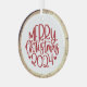 Red Script Merry Christmas 2024 script type red glass ornament on a rustic wood slice. A great Christmas gift or holiday home decor item. White script on black.