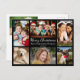 Modern photo collage black holiday postcard that features "Merry Christmas" in an elegant white script, 6 pictures of your favourite people and moments from the last year and your family name and the year in simple lettering. Add a 7th photo and your custom message on the back.