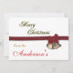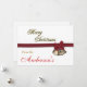 Classic red and white colours with gold script Merry Christmas and two bells with holly on a red ribbon. Beautiful clean and classic look.