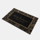 Modern welcome doormat with a gold script on a gold black abstract swirl background. Personalise with your family name or text.