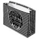 Add rustic holiday charm to your gift giving with this personalised buffalo plaid Christmas gift bag from Plaid Perfection. Featuring a classic black and white plaid background, the design is accented with a festive white circular “Merry Christmas” emblem surrounded by snowflakes, reindeer, and trees. Customise with your family name or recipient’s name for a truly one-of-a-kind presentation. Perfect for wrapping Christmas gifts, holiday party favours, or seasonal treats, this sturdy and glossy gift bag makes every package feel extra special.