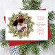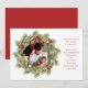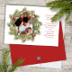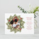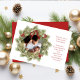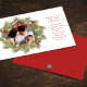 This design features Merry Christmas with merry Christmas holiday wreath with a modern photo family 1 one picture layout, simple elegant family minimalist, rustic green typography script red, a trendy botanical pine nature leaves, stylish trendy brush script font, simple watercolor greenery branches, Christmas holiday red holly berries, green winter foliage holly berry, Christmas holiday photo birth announcement cards
