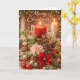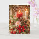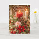 This elegant Christmas greeting card features a glowing red candle surrounded by lush evergreen branches, pinecones, berries, ornaments, and festive poinsettias. Golden sparkles and delicate snowflakes enhance the warm, cozy holiday atmosphere, while graceful “Merry Christmas” lettering adds a classic touch. Perfect for sharing heartfelt wishes, this timeless design captures the beauty, warmth, and magic of the Christmas season in a traditional yet luxurious style.