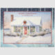 Your message is easily personalised (or delete if not needed). An adorable White Cape Cod home with green shutters is decorated for Christmas. It sits in a snowy landscape with a background of ocean water and border of a snowy forest winter scene. A beautiful collage is overlaid with a soft white ephemera layer that has handwritten calligraphy script and other vintage elements adding texture and elegance. Graphically designed by internationally licensed artist and designer, Audrey Jeanne Roberts, Copyright.