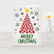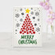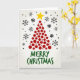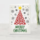This cool holiday card is all about Christmas cheer! 🎅🏼🎄 It shows a modern twist on a Christmas tree made of red circles in different sizes stacked up in a triangle shape. On top of the tree is a bright yellow star shining with hope. The background is simple and white with little black snowflakes scattered around. The colors are strong and bold - red, yellow, black, and white. Across the card, in pretty green letters, it says "MERRY CHRISTMAS" with a cozy, handwritten feel. It's a perfect card to bring joy and warmth to your loved ones during the holidays. 🎁