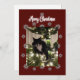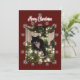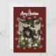 Christmas card with my Tuxie cat on the tree. Burgundy background. Merry Christmas.