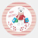 A cute sticker to embellish your Holiday mail and/or presents . It has a cute cartoon polar bear with a red sweater . He/she is carrying shopping bags . The words say "Merry Christmas !" but feel free to change it with your own using the template . The stickers also have a pink border with thin red stripes .