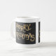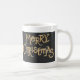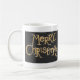 A stylish white coffee mug with'Merry Christmas' on a black background in gold and silver lettering, from a handpainted design by Judy Adamson. Matching greeting card also available.