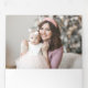 This fun and festive holiday template features a cute coral red coquette watercolor bow with white polka dots, ivory rose and pine, wavy coral ribbon frame, custom Merry Christmas calligraphy graphic and a one-photo landscape-aspect template on a pastel polka dot background. The panels feature complementary floral graphics, text fields and three additional photo templates.