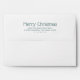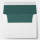 Return address envelope featuring the text "Merry Christmas" in a cute display font with the return address below and a pattern of cute dotted stripes on a pine green background inside.