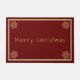 Doormat shown with a deep red burgundy background, silver-coloured and gold-coloured borders surrounding the doormat and phrase of "Merry Christmas" in a upbeat text in gold-coloured near bottom of doormat and four snowflakes in gold-coloured .