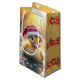 A fluffy duckling wearing a Santa hat floats serenely on a pond surrounded by water lilies.