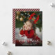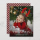 Elegant Christmas Holiday Photo card with decorative typography over full bleed photo. Transparent gradient overlay (optional) for light photos. Red and white candy cane stripes backer.