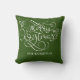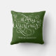 Merry Christmas Fancy Script Name Custom Throw Pillow. MERRY CHRISTMAS greeting in an elegant and fancy calligraphy script typography in your choice of colours (shown in white on green). Personalise this throw pillow with your family's name to customise your holiday decor. ASSISTANCE: For help with design modification, transferring the design to another product or if you would like coordinating items, contact the designer BEFORE ORDERING via the Zazzle Chat MESSAGE tab below or email makeitaboutyoustore@gmail.com.