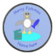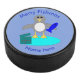 This awesome hockey puck features a cute little grey and white penguin with beady black eyes and yellow beak and feet. The penguin is holding a big blue fish with one flipper and standing on a pale blue lump of ice. There is an open present next to the penguin complete with a festive ribbon.