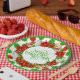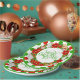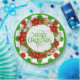 Vibrant and festive paper plate with a "Merry Christmas" floral wreath and a pattern of large dots in traditional Christmas green and red colours on white background.
