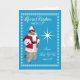 Wish anyone a Merry Christmas (from both of us) with an adorable racoon dressed as Santa Claus holding on to his belt next to a pretty white star. Background is a light blue with a white snowflake border with white fancy text.