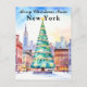 A festive postcard featuring a beautifully decorated Christmas tree in snowy New York City, with the skyline as a backdrop. A holiday greeting card that says “Merry Christmas from New York.”