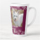 Tall burgundy wine coloured latte mug with two photo templates and custom text. A snowflake design at top and bottom makes this a perfect Christmas gift or winter birthday gift. Personalise the text with a name and customise in two lines beneath angled photos of cats, dogs, or any pet. Or make it with pictures of people - whatever you like. The pretty wine purple colour makes the furbaby photos stand out. Text is white.