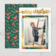 Keep spirits high this holiday season with custom photo cards! A chic design perfect for any modern family! This card features your custom photo with a white frame, faux gold foil, a pale dusty blue watercolor wash, and a pattern of poinsettia flowers and winter greenery. At the top, "merry christmas" appears in gold hand-lettered calligraphy with your family name in simple capital letters. Cards reverse to the same floral pattern. Click on "Personalise this template", change the text, and upload your photo to make your own! Visit our store for more designs!