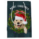 Cute golden retriever dog in Christmas pine wreath with gingham bow and glowing light string.