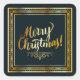 Elegant Merry Christmas in golden yellow coloured script font with a golden accent flourish set in gold yellow coloured geometric frames. Set on solid black pearl deep blue