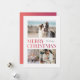 This 3-photo Christmas card features simple ombre type in shades of red and pink on a white background. It has one large photo, and 2 smaller photos are on the front. The back of the card has a solid red and pink gradient.